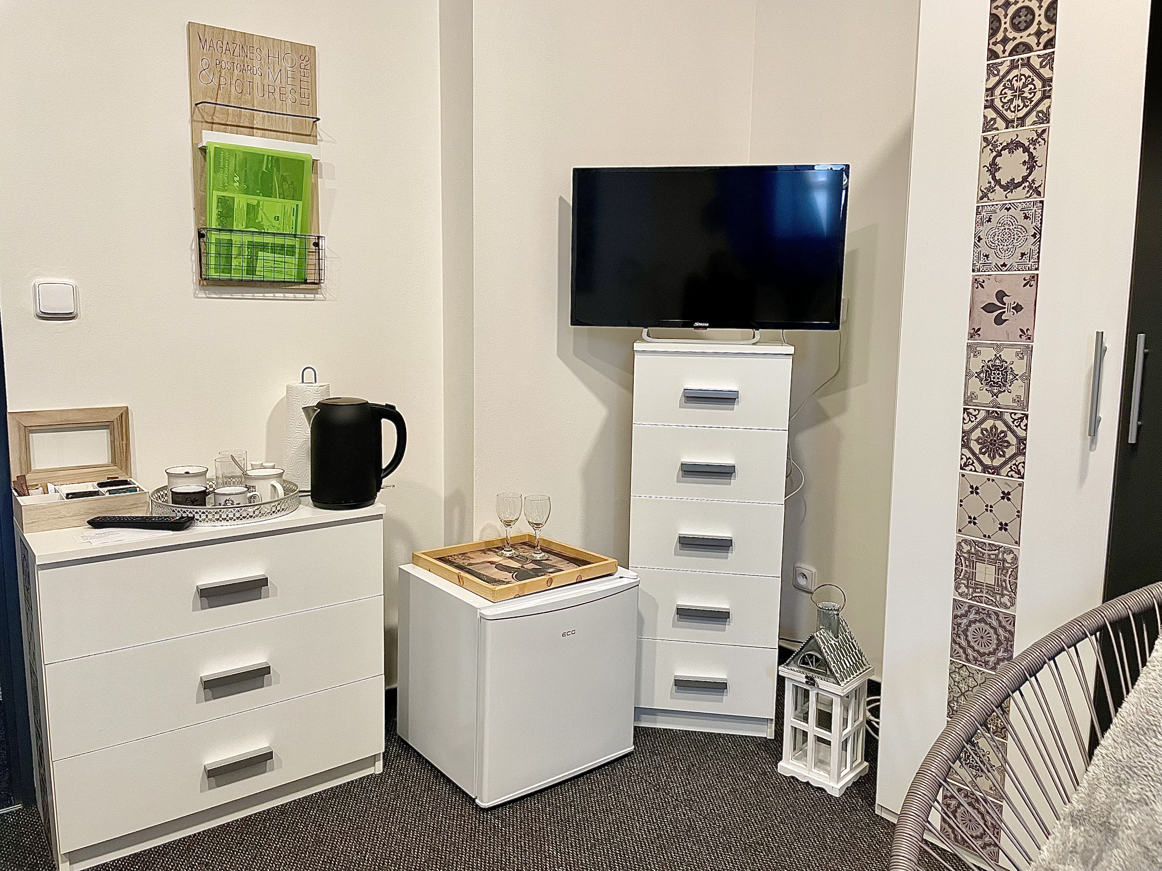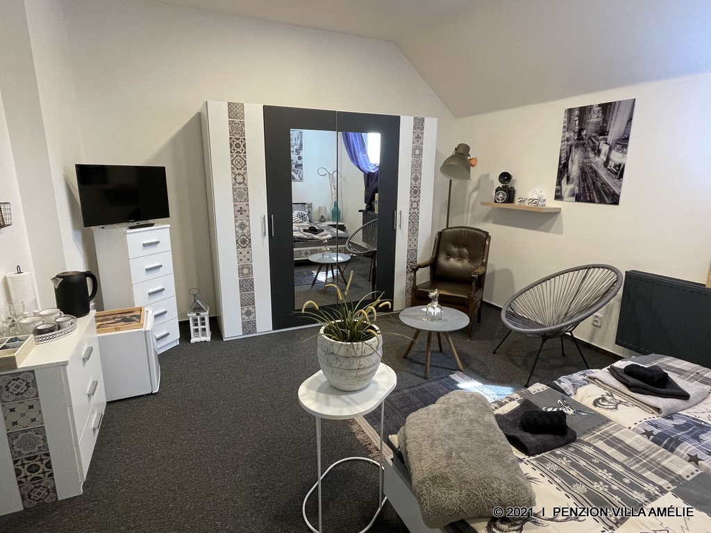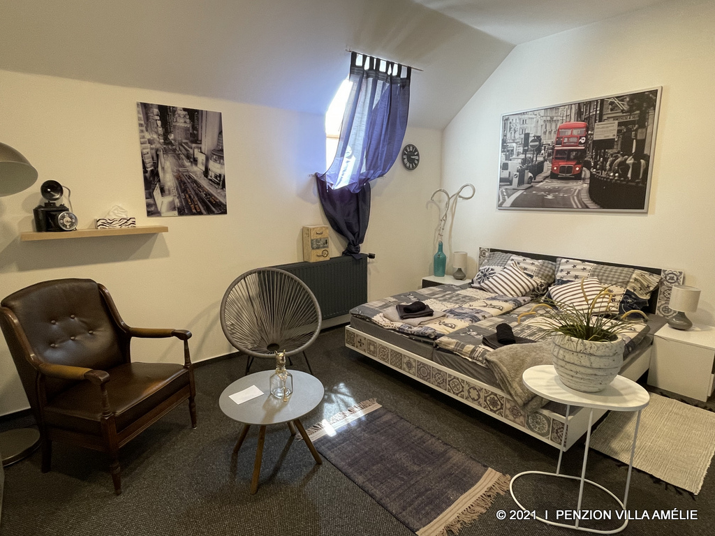 Hravý plně vybavený pokoj s wifi připojením a samostatným vstupem na zahradu. V pokoji je k dispozici minibar, rychlovarná konvice s pestrou nabídkou čajů a kávy, televizor, sprchový kout, fén, bačkory a řada kosmetických vzorků. Snídaně dle vašeho výběru se podává přímo na pokoji nebo lze využít prostory recepce.