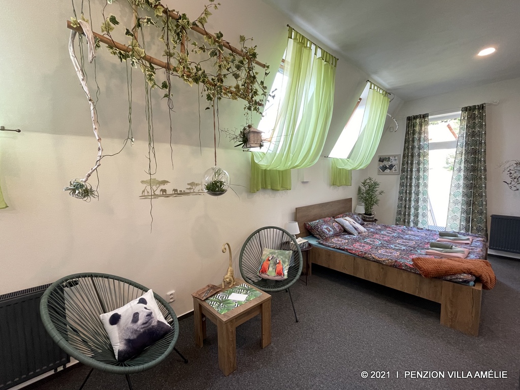 Hravý plně vybavený pokoj s wifi připojením a samostatným vstupem na zahradu. V pokoji je k dispozici minibar, rychlovarná konvice s pestrou nabídkou čajů a kávy, televizor, sprchový kout, fén, bačkory a řada kosmetických vzorků. Snídaně dle vašeho výběru se podává přímo na pokoji nebo lze využít prostory recepce.