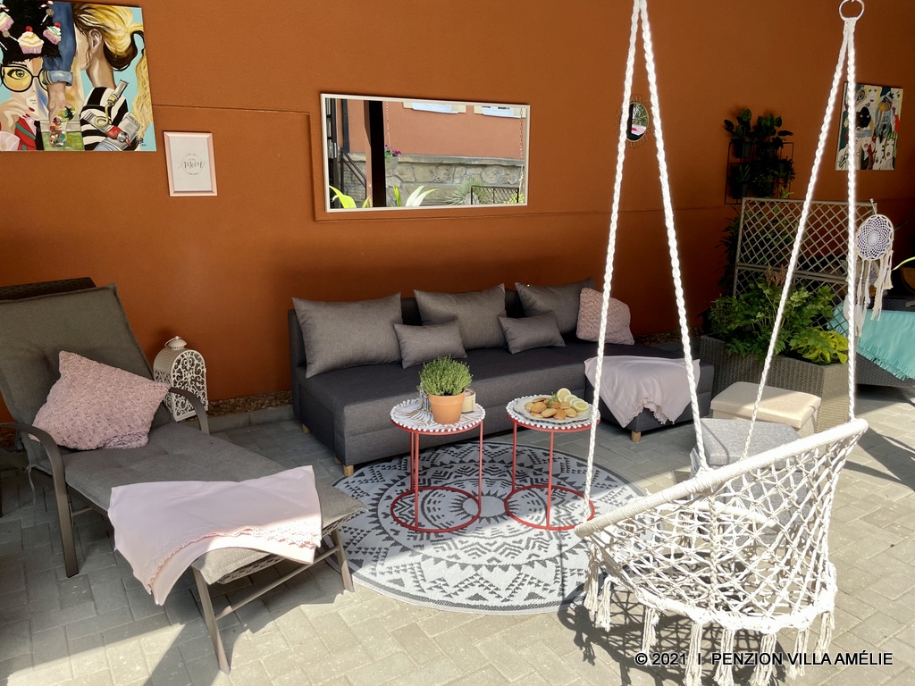 Klidnou atmosféru umocňuje zahrada s ovocnými stromy a rozlehlou terasou s posezením a možností domácího občerstvení.