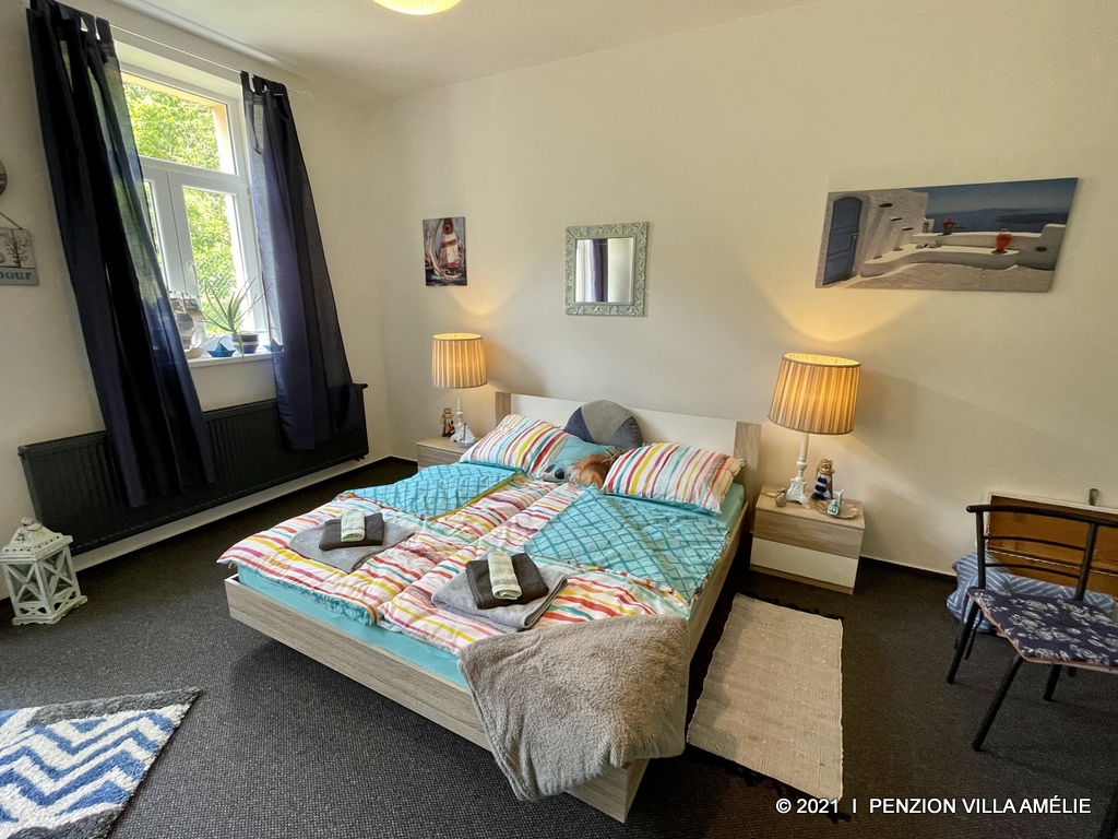 Prostorný plně vybavený pokoj v námořnickém stylu s wifi připojením a samostatným vstupem na zahradu. V pokoji je k dispozici minibar, rychlovarná konvice s pestrou nabídkou čajů a kávy, televizor, sprchový kout, fén, bačkory a řada kosmetických vzorků. Snídaně dle vašeho výběru se podává přímo na pokoji nebo lze využít prostory recepce.