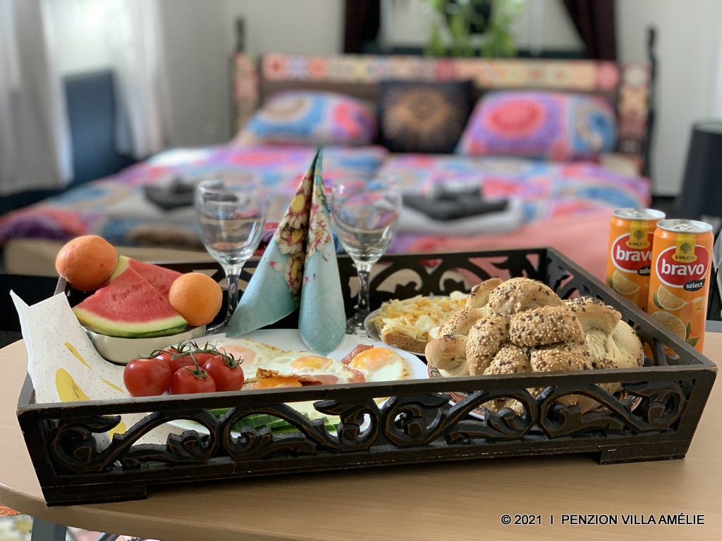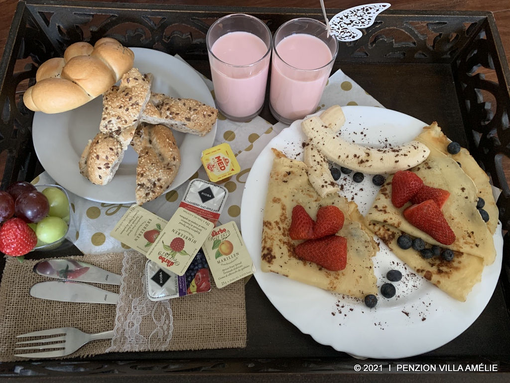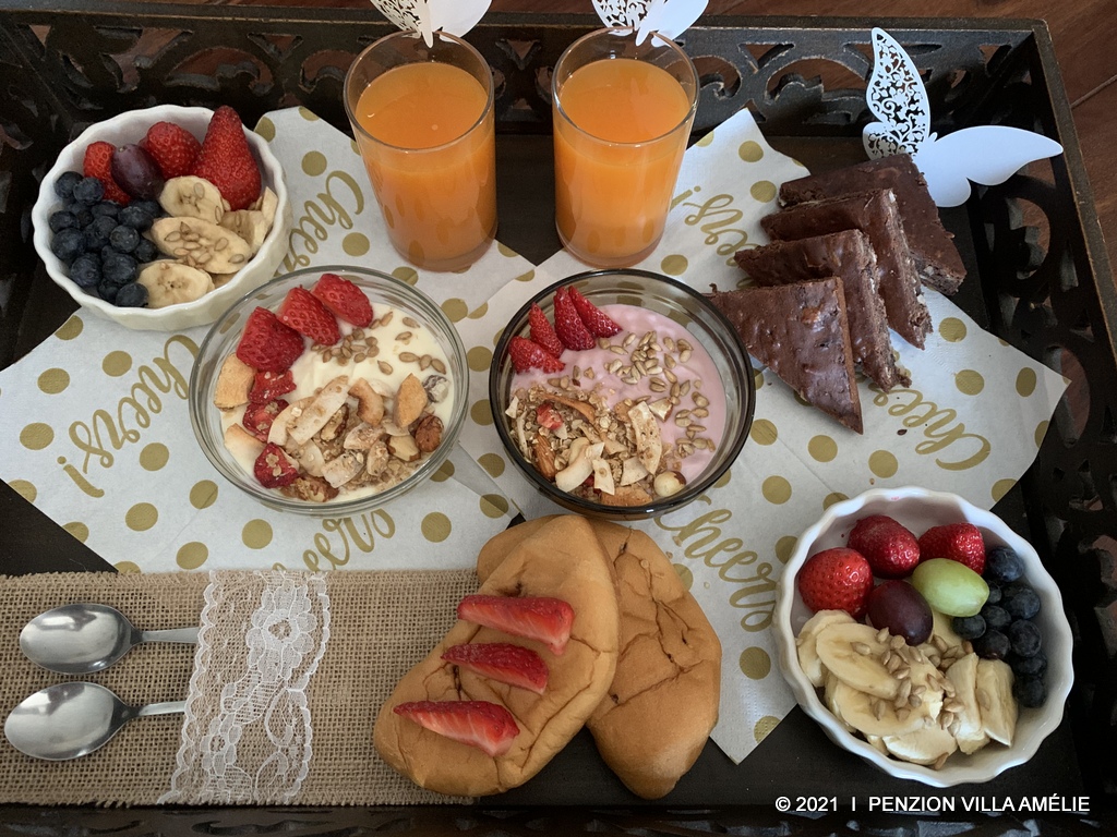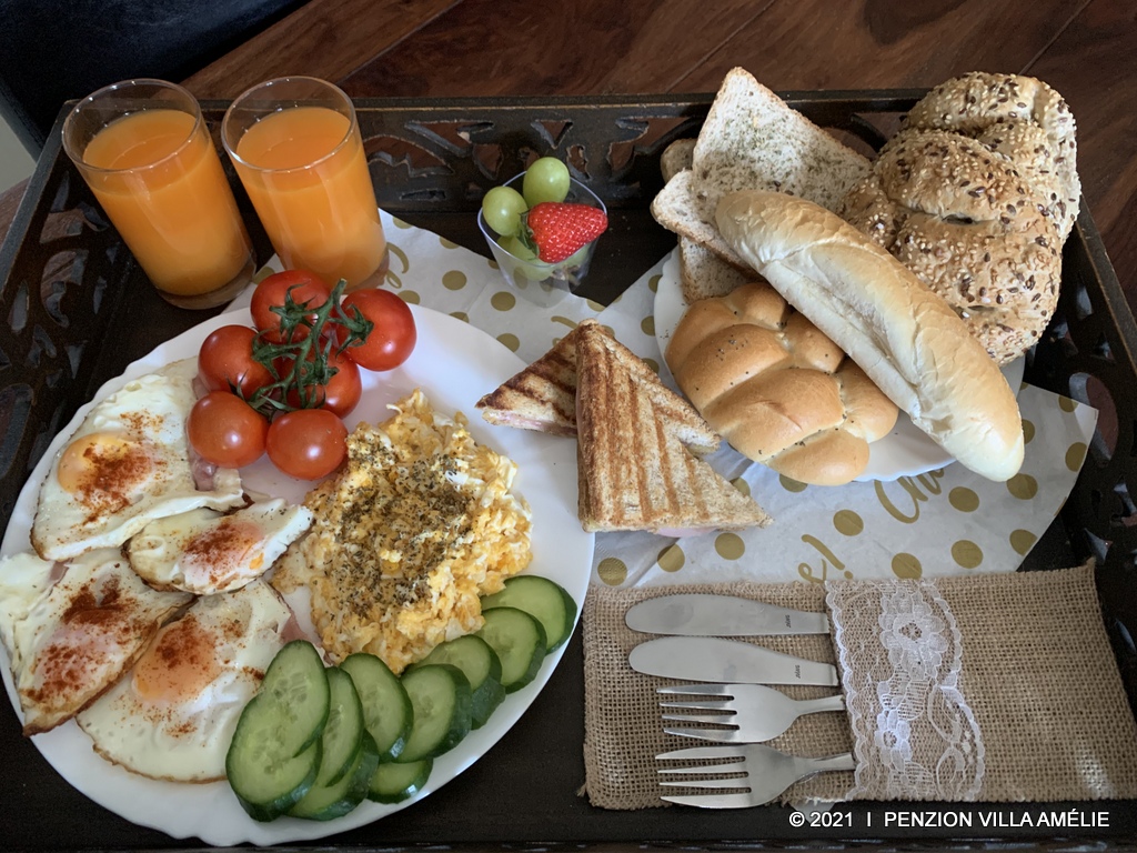 Bohaté snídaňové menu servírované přímo na pokoj je u našich klientů velmi oblíbené.