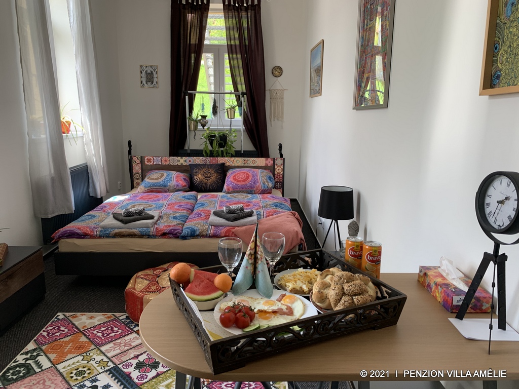 Hravý plně vybavený pokoj s wifi připojením a samostatným vstupem na zahradu. V pokoji je k dispozici minibar, rychlovarná konvice s pestrou nabídkou čajů a kávy, televizor, sprchový kout, fén, bačkory a řada kosmetických vzorků. Snídaně dle vašeho výběru se podává přímo na pokoji nebo lze využít prostory recepce.